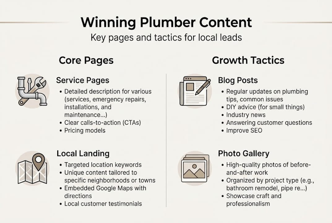 Service pages tailored to local areas, customer testimonials, FAQs, and blogs addressing common plumbing issues are most effective. Blogs and FAQs drive more local leads than generic homepage copy alone.